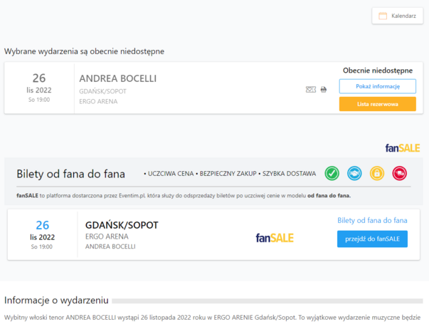 ⭐ Fanbonus - program lojalnościowy oferujący zwrot wartości zakupionych w całym roku biletów w wysokości 3%. Zwrot odbywa się w formie Vouchera Eventim;